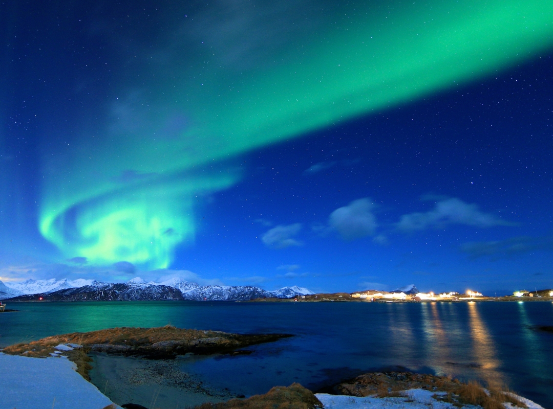 Al terminar, regresaremos a Svolvær, donde el tiempo libre nos permitirá explorar a fondo la capital de Lofoten. Las opciones son variadas: desde visitar el peculiar Magic Ice Bar para una experiencia helada, hasta pasear tranquilamente por el puerto. Al anochecer, la atención se dirige al firmamento, pues la ubicación privilegiada de Svolvær ofrece una de las mejores oportunidades para presenciar la mágica danza de la aurora boreal sobre los fiordos y montañas