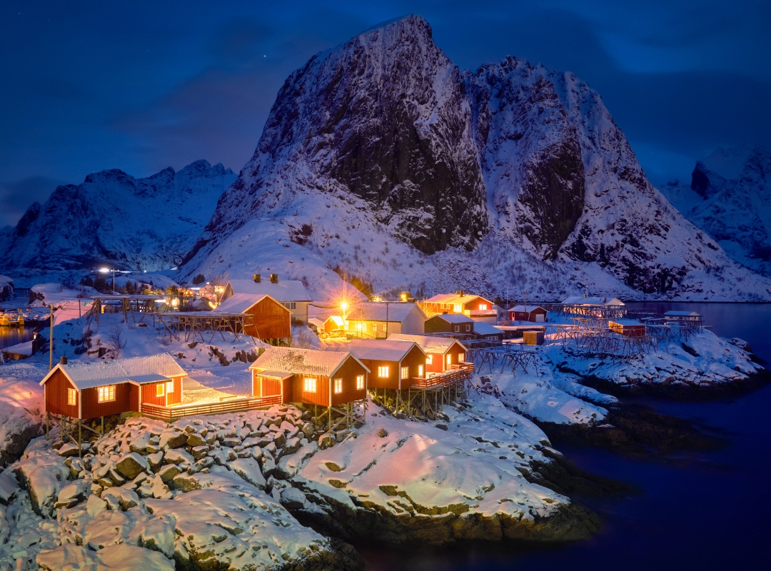 Realizaremos paradas estratégicas en algunos de los escenarios más fotografiados del planeta: Hamnøy y Sakrisøy, conocidos por sus icónicas cabañas rojas y amarillas sobre pilotes. El clímax de la ruta lo alcanzaremos en el pueblo de Å (sí, solo una letra), un lugar que encapsula la autenticidad pesquera de Lofoten, con vistas inmejorables de montañas que se precipitan al mar.